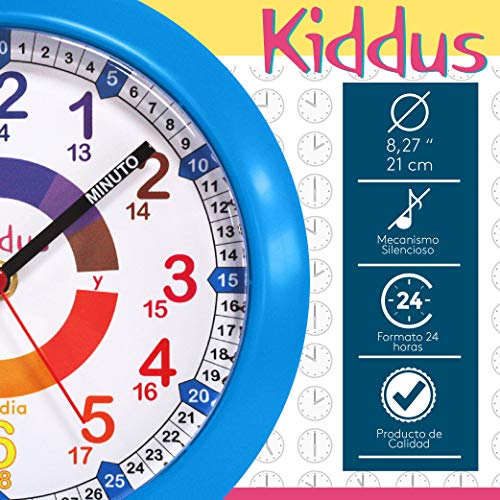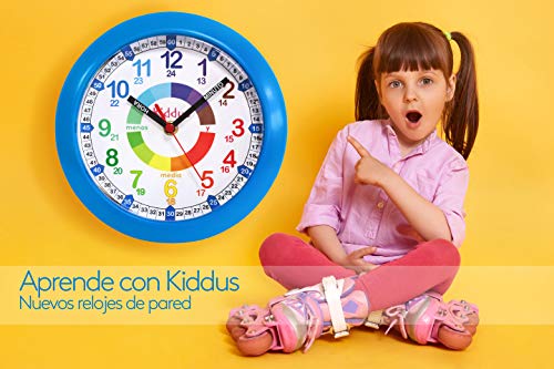 KIDDUS Orologio da Parete Didattico per Bambini, Ragazzi. Analogico. Con Esercizi per Imparare a Leggere l'Ora. Movimento al Quarzo Silenzioso. ESPAÑOL AZUL
