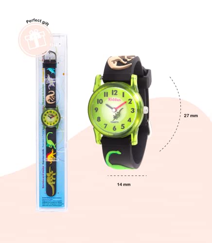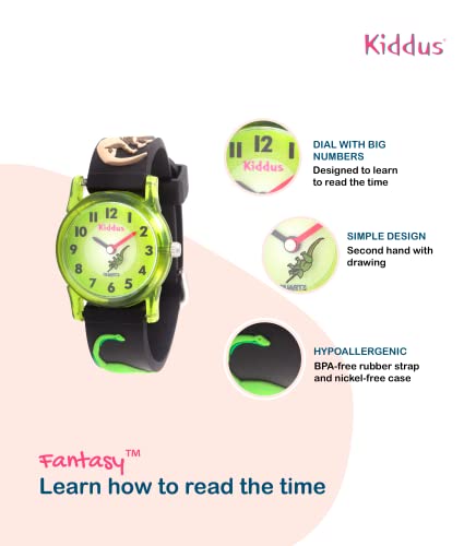 Kiddus Orologio da Polso, Analogico. Per Bambini, Ragazzi. Con Esercizi per Imparare a Leggere l'Ora. Facilità di Lettura. Movimento al Quarzo Giapponese. Dino