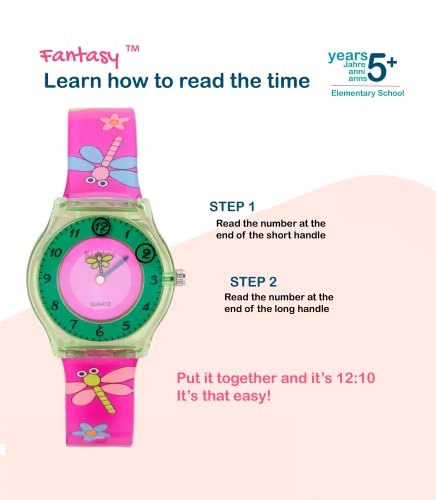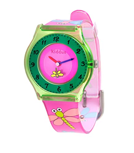 Kiddus Orologio da Polso, Analogico. Per Bambini, Ragazzi. Con Esercizi per Imparare a Leggere l'Ora. Facilità di Lettura. Movimento al Quarzo Giapponese. Libellula