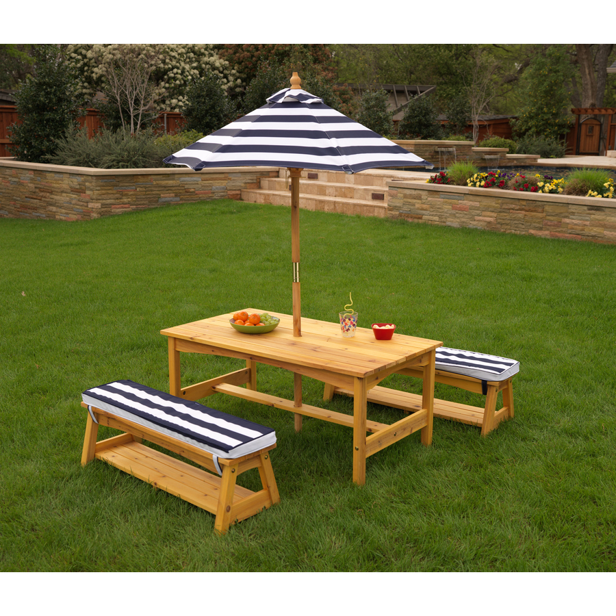 la luce del sole distruggerà il rivestimento nel tempo. Per questo motivo, si raccomanda vivamente di trattare il legno annualmente con un agente idrorepellente o una vernice. Per un prodotto consigliato, rivolgersi al proprio fornitore di colori o vernici. KidKraft utilizza solo legno di alta qualità per garantire un prodotto sicuro per i vostri bambini. Sebbene sia stato fatto ogni sforzo per selezionare il legno della migliore qualità disponibile, il legno è comunque un prodotto della natura. Come per tutti i legni, crepe e piccole spaccature nelle venature sono normali. Si raccomanda di levigare le crepe quando compaiono e di applicare un idrorepellente. tiger Si tratta di una parte della manutenzione che dovrebbe essere eseguita almeno una volta all'anno per mantenere e massimizzare la durata e le prestazioni della casetta. Incluso nella fornitura: 1 x Kidkraft ® Set da giardino per bambini con panchine, cuscini e ombrellone, marine blu