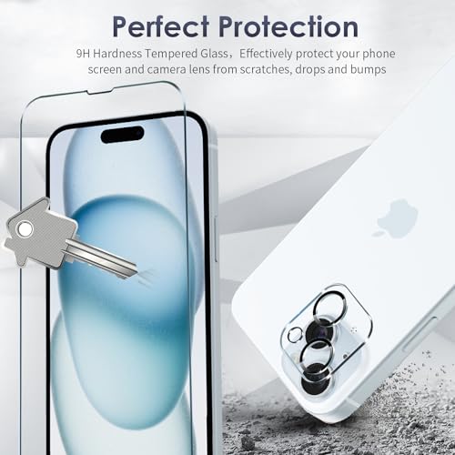 Kiewhay Pellicola Protettiva Compatibile con iPhone 15 Plus Vetro Temperato 6,7'', 3x Pellicola Vetro + 2x Pellicola Fotocamera, [Non per iPhone 15 Pro Max] 99,99% HD Pellicola Vetro - 5 Pezzi