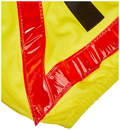 Materiale giallo fluorescente altamente visibile con triangoli rossi riflettenti per essere visti al crepuscolo, di notte o con il cattivo tempo.