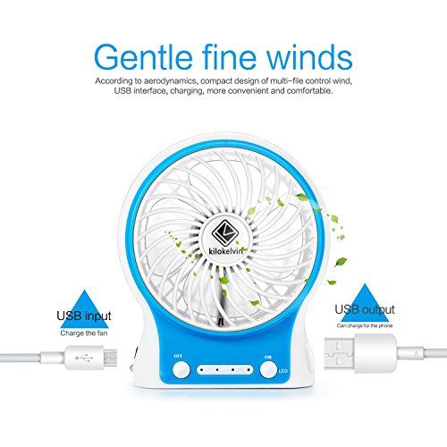 Kilokelvin Ventilatore USB Mini Ventilatore Portatile Ricaricabile Scrivania Ventilator da Tavolo Fan Personal 3 Modalita di Velocita del Vento Regolabile (Blu)