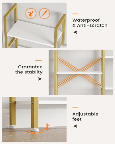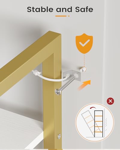 Forte e stabile: l'acciaio resistente e il truciolato di alta qualità garantiscono la struttura stabile di questa libreria. Le colonne a forma di X sul retro sono rinforzate. Ogni piastra ha una capacità di carico fino a 10 kg. Inoltre dispone di piedini regolabili in altezza per adattarsi alle irregolarità pavimenti. Questa libreria è dotata di una protezione antiribaltamento, quindi non dovrai preoccuparti che lo scaffale si ribalti e che gli oggetti cadano.