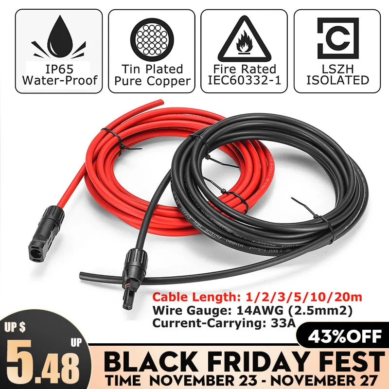 2.5mm 14 AWG KINCO 1 Pair Solar Panel Extension Cable Copper Wire Black and Red with for Connector Solar PV Cable