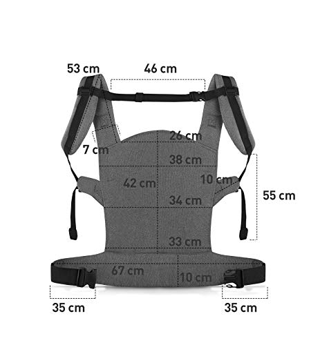 REGOLABILE: può essere adattato con il materiale regolabile protetto con una resistente chiusura in velcro. Anche gli spallacci sono regolabili. Ciò permette di adeguare perfettamente il marsupio al genitore e al bambino