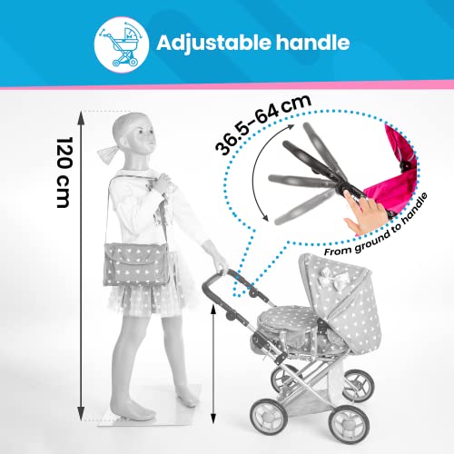 Kinderplay Carrozzina per Bambole, Passeggino per Bambole - Altezza Della Maniglia Regolabile di 36.5-64 cm, Passeggino Giocattolo 3in1, con Borsa, KP0200S