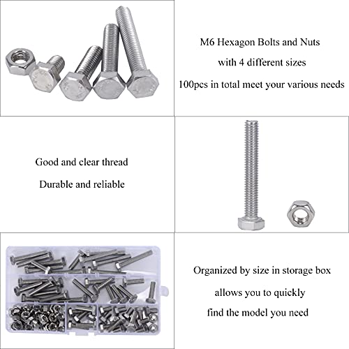√ Specifiche: questo set di bulloni esagonali include 4 dimensioni: 40 mm (10 pezzi), 30 mm (10 pezzi), 20 mm (15 pezzi), 10 mm (15 pezzi), quanto sopra è solo la lunghezza della filettatura, esclusa la lunghezza del testa esagonale. Ci sono anche 50 dadi M6, una chiave inglese gratuita e una scatola di plastica.