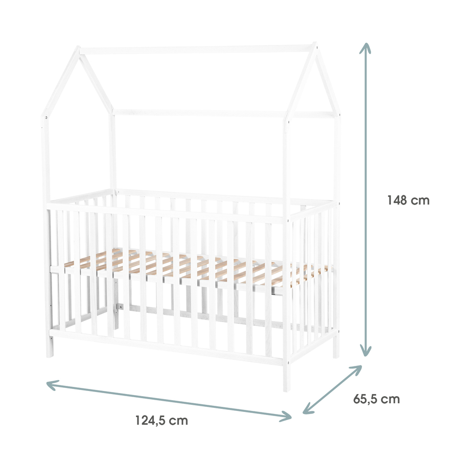 Dettagli del prodotto: Colore: bianco, che può essere combinato con molti disegni Regolabile in altezza in 6 posizioni e quindi adattabile alle dimensioni del bambino Innumerevoli usi: puoi creare un ambiente perfetto per dormire e per il gioco Ultimi standard di sicurezza: sviluppati secondo le norme EN 716 - 1:2017 e AC:2019, che specificano la sicurezza dei letti per bambini con una lunghezza interna maggiore di 90 cm Istruzioni di montaggio Materiale e cura: Telaio: Legno massiccio e MDF Barre piatte: compensato Telaio a doghe: compensato Un vantaggio del legno massiccio è la sua robustezza e stabilità. Con i mobili naturali in legno massiccio, si può vivere intensamente senza doversi preoccupare costantemente che non resistano all'uso intenso. Tutti i materiali sono testati e privi di sostanze nocive Dimensioni e peso: 124,5 x 65,5 x 148 cm (larghezza x profondità x altezza) Superficie di sdraio: 60 x 120 cm Regolabile in altezza a: 13,5 cm;