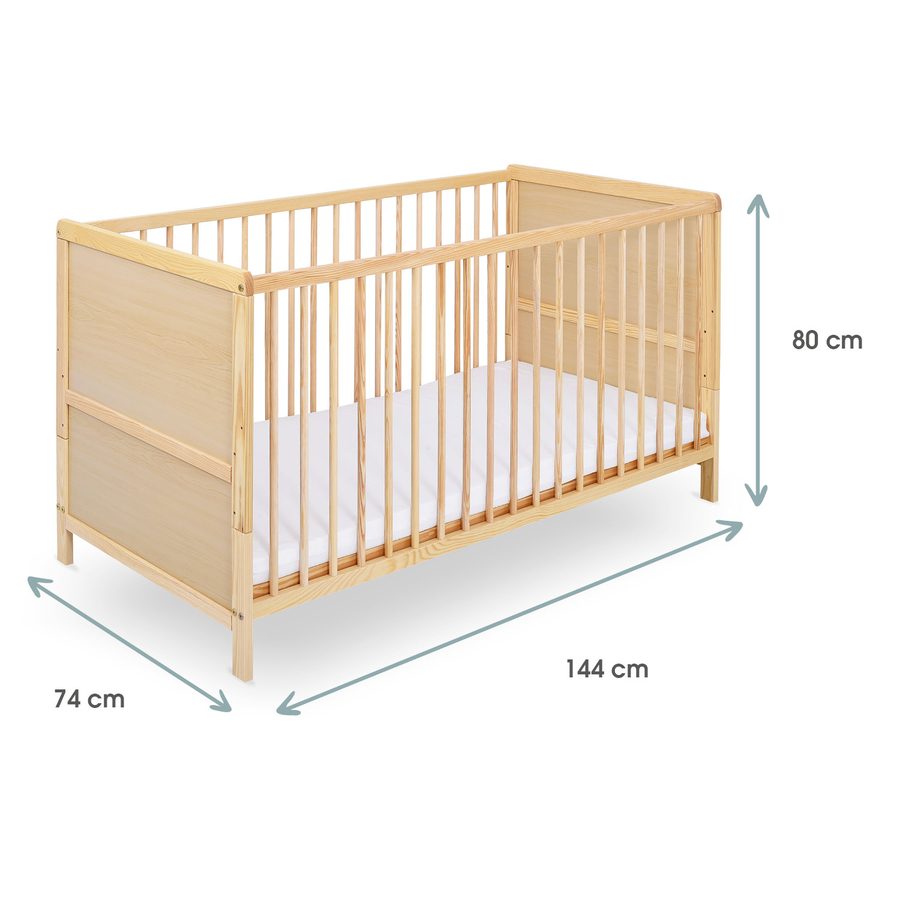 Dettagli del prodotto: Regolabile in altezza: altezza regolabile in 3 posizioni a 12 cm, 32 cm o 45 cm. Materiali durevoli: struttura a doghe in legno di molle altamente elastico e compensato impiallacciato stabile e durevole. Ingresso e uscita facili: tre pioli scorrevoli per facilitare l'ingresso e l'uscita del bambino. Colore: naturale, abbinabile a diversi Design s Modern it Design: Struttura in legno a vista in un bellissimo design a tinta unita Design Utilizzo a lungo termine: trasformabile in un letto Junior, in modo che il letto possa essere utilizzato il più a lungo e nel modo più sostenibile possibile. Vernice controllata: la vernice è resistente al sudore e alla saliva e priva di sostanze nocive. Istruzioni per l'installazione Dimensioni e peso: Letto: 74 x 144 x 80 cm (larghezza x lunghezza x altezza). Superficie di sdraio: 70 x 140 cm Distanza tra le barre: 5,5 cm Caricabile fino a 30 kg Materiale e cura: Telaio: Pino massiccio, smaltato Testata e pediera: HDF, smaltato Il letto per bambini certificato FSC® è realizzato con materie prime provenienti da una silvicoltura sostenibile e responsabile. Per la pulizia e la cura, utilizzare un panno umido e un detergente delicato, ad esempio una soluzione di sapone. La consegna include: Letto, rete a doghe e quattro blocchi di conversione. Consegnato smontato per l'autoassemblaggio, le istruzioni di montaggio facili da seguire consentono un montaggio senza problemi. Attenzione: la decorazione e il materasso non sono inclusi nella consegna.