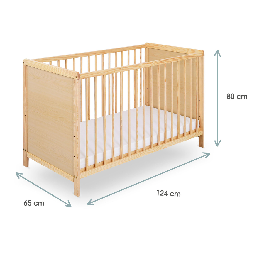 istruzioni di montaggio Dimensioni e peso: Letto: 65 x 124 x 80 cm (larghezza x lunghezza x altezza). Superficie di sdraio: 60 x 120 cm Distanza tra le barre: 5,5 cm Caricabile fino a 30 kg Materiale e cura: Telaio: Pino massiccio, laccato e tinto Testata e pediera: HDF Il letto per bambini certificato FSC® è realizzato con materie prime provenienti da una silvicoltura sostenibile e responsabile. Per la pulizia e la cura, utilizzare un panno umido e un detergente delicato, ad esempio una soluzione di sapone. La consegna include: Letto e rete a doghe Consegnato smontato per l'autoassemblaggio, le istruzioni di montaggio facili da seguire consentono un montaggio senza problemi Attenzione: decorazioni e materasso non inclusi nella consegna