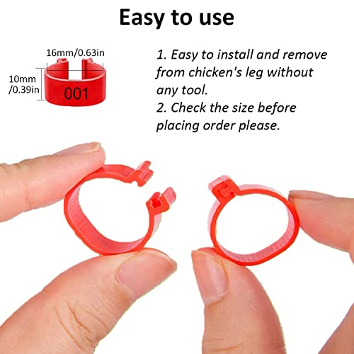 Il pacchetto include: Questa confezione contiene 100 pezzi di anelli di cosce di pollo da 16 mm in 5 colori, tra cui rosso (001-020), giallo (021-040), verde (041-060), blu (061-080) e viola (081-100). I numeri stampati non sono facili da macchiare, macchiare o scomparire, rendendo facile trovare il tuo pollo o uccello.