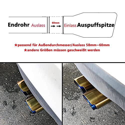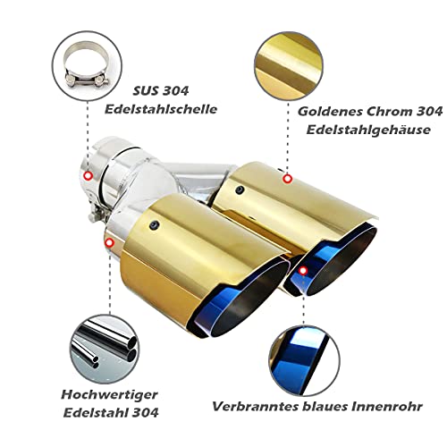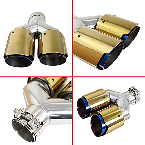 Kipalm Terminale di scarico per auto, 60 mm, in acciaio inox, doppia uscita per scarico da 2,37 pollici (oro e blu) a sinistra