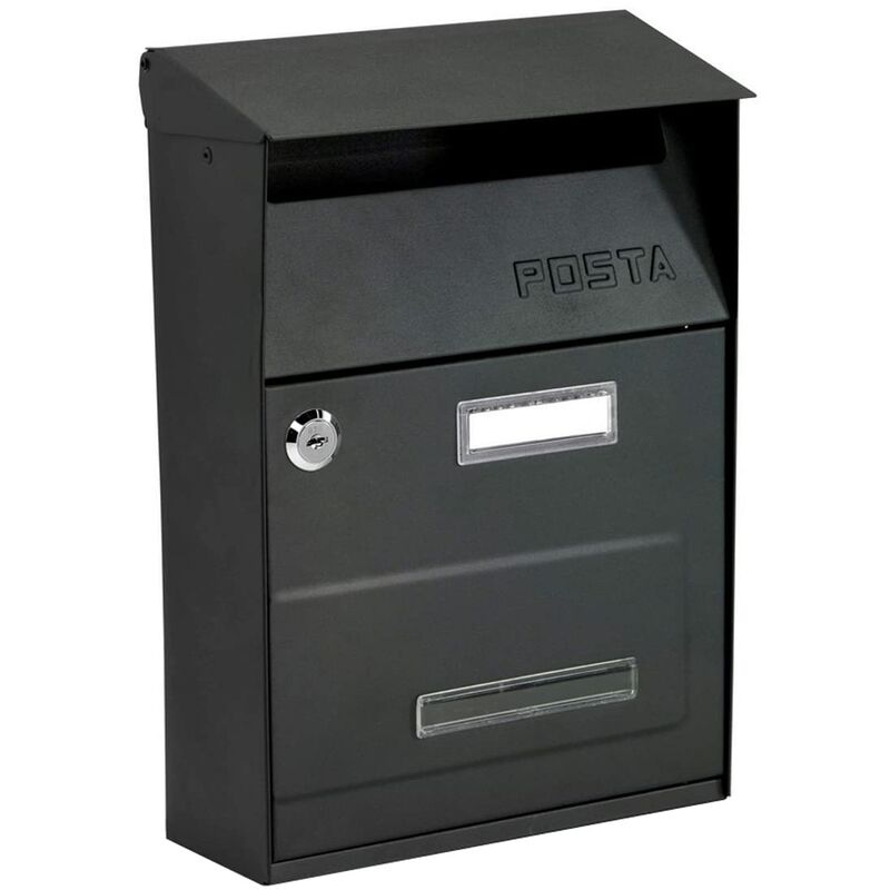 Cassetta delle lettere in colore nero, lamiera verniciata a fuoco, apertura frontale e superiore per imbuto. Dimensioni (A x L x P): 320 x 100 x 220 mm. Due chiavi doppie fornite.