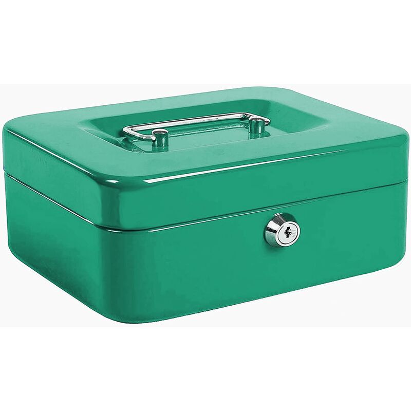 Descrizione Cassetta portavalori con mensoletta porta spiccioli in plastica, struttura in lamiera verniciata a fuoco di colore verde, serratura a cilindro con due chiavi.