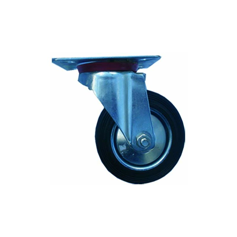 Ruota industriale con piastra girevole. Nucleo composto da due dischi in lamiera. Rivestimento con anello in gomma standard e mozzo con cuscinetti a rullo.