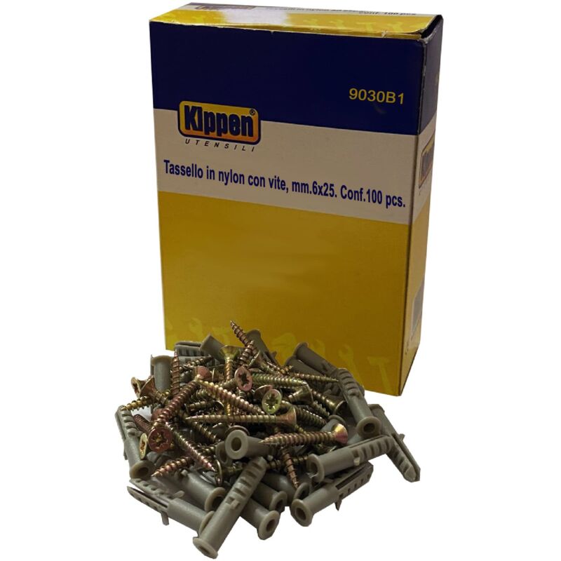 Confezione da 100 Tasselli in Nylon con Viti. Misura 6x25 mm.
