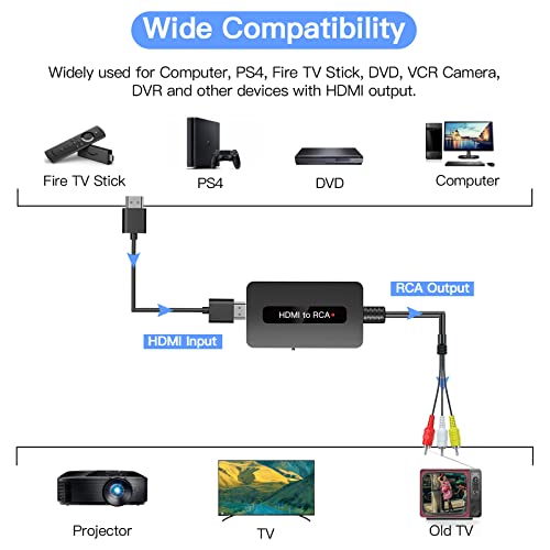 【Ampiamente Compatibile】 Questo adattatore convertitore da HDMI a RCA è ampiamente utilizzato con dispositivi con uscite HDMI da visualizzare su vecchi televisori con ingresso RCA, come: lettore DVD, STB, PS3, PS4, chiavetta TV HDMI, PC e altro.