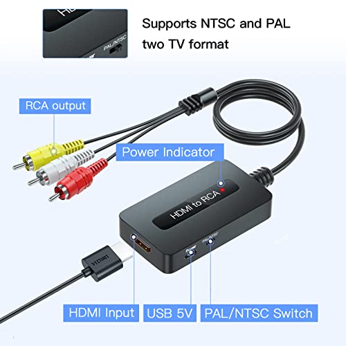 【Uscita Formati TV PAL/NTSC】 Questo convertitore da HDMI a RCA CVBS supporta due formati di uscita PAL e NTSC con pulsante di commutazione, solitamente PAL per UK e EU. Nota: se la tua TV mostra in bianco e nero, cambia il formato di uscita RCA NTSC in RCA tramite l'interruttore sul convertitore.