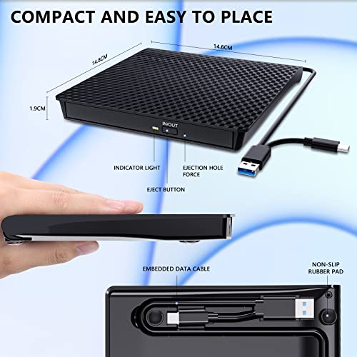 PLUG & PLAY - Lettore cd esterno viene alimentata tramite la porta USB/Type-C Non sono necessari driver o alimentazione aggiuntiva. Questa unità CD DVD esterno può essere utilizzata per guardare film, masterizzare file, installare software o creare un CD di backup, presentazioni immagini vacanze, la raccolta MP3 o interi film di gioco, ecc., che copre tutte le vostre esigenze di masterizzazione e riproduzione.