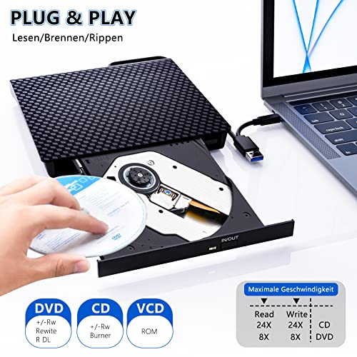 PRESTAZIONI ECCELLENTI - Masterizzatore dvd supporta qualsiasi laptop o desktop con una porta USB o C. Il masterizzatore esterno supporta DVD-ROM, DVD Video, CD-R/RW, CD-ROM/XA, CD-ROM, CD-EXTRA, CD-TEXT. Inoltre, supporta anche DVD-R,DVD+R, DVD-RW, DVD+RW, DVD+R DL, DVD-R DL & DVD-RAM. La massima velocità di lettura DVD è 8 volte, la velocità massima di lettura CD è 24 volte e la velocità massima di scrittura CD è 24 volte. Forte correzione degli errori, tecnologia di riduzione degli urti.