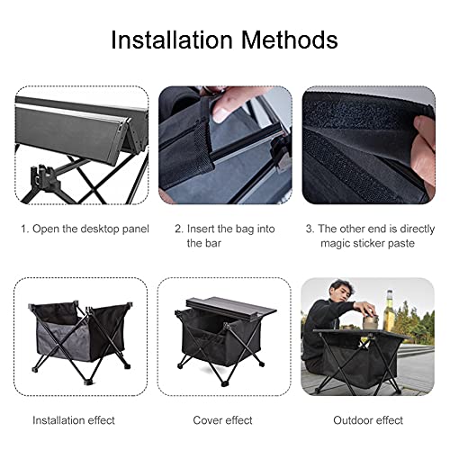 Facile da installare: non sono necessari attrezzi. Aprire la borsa, aprire il telaio di base ed estendere il supporto, fissare il piano del tavolo e si può iniziare a utilizzare. Puoi anche assemblarlo usando una sola mano