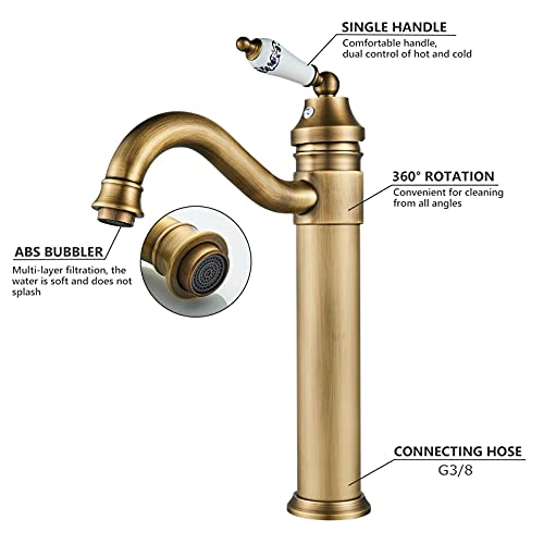 Kisimixer Rubinetto Alto Lavabo Bagno Può Ruotare di 360 °Rubinetto Lavabo Bagno Monocomando in Ceramica Miscelatore Lavabo Bagno,Ottone Antico