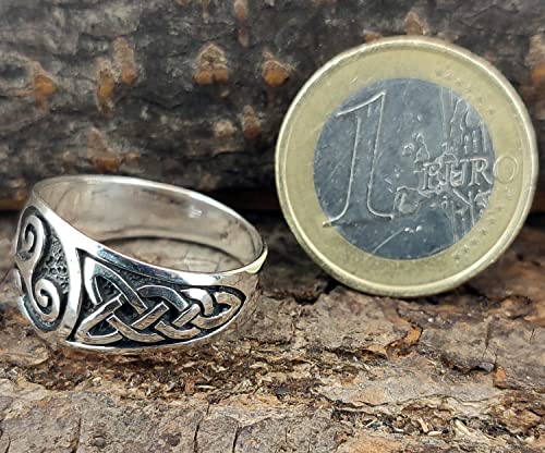 Anello in argento sterling 925 dal design artistico. L'anello è decorato con un triscele e con nodi celtici.
