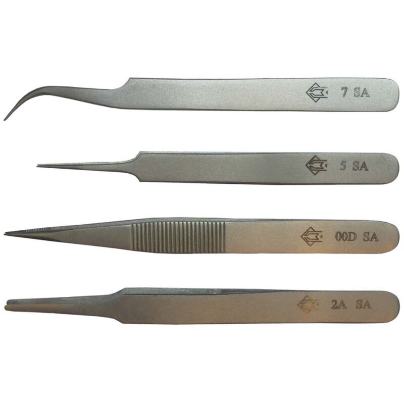 Set di 4 pinzette professionali in custodia di plastica.Realizzate in acciaio amagnetico resistente agli acidi (SA).Fornite in un rotolo di plastica trasparente con la punta protetta da un cappuccio in silicone trasparente.Numero di prodotti nella confezione: 4 PezziColore: ArgentoMateriale: Acciaio...