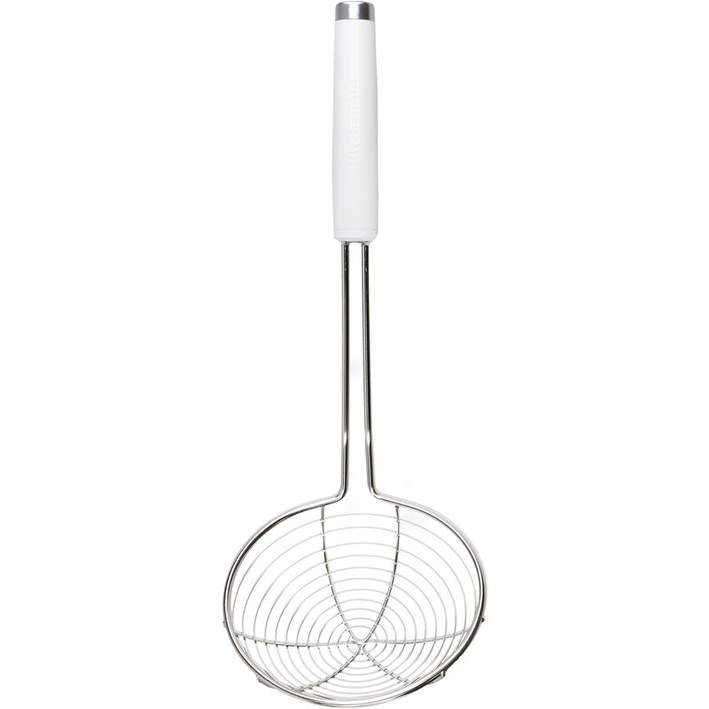 Questa versatile schiumarola KitchenAid raccoglie wonton e gnocchi con facilità. Il cestello extra-largo in acciaio inox consente di far defluire rapidamente i liquidi, rendendolo un ottimo strumento per saltare in padella o per l'uso con il wok. La testa del colino è realizzata in acciaio inossidabile robusto e resistente alla ruggine. Il manico lucido è dotato di un logo in rilievo e di un well, un supporto cromato satinato e un occhiello per appenderlo. È lavabile in lavastoviglie per una facile pulizia.
