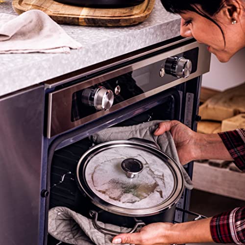 Durevole bordo chiuso in acciaio inox per versare senza gocciolare. Coperchi in vetro temperato per una cottura precisa. Adatto a tutti i piani cottura, incluso induzione. Adatto per forno fino a 220 °C. Lavabile in lavastoviglie per una facile pulizia