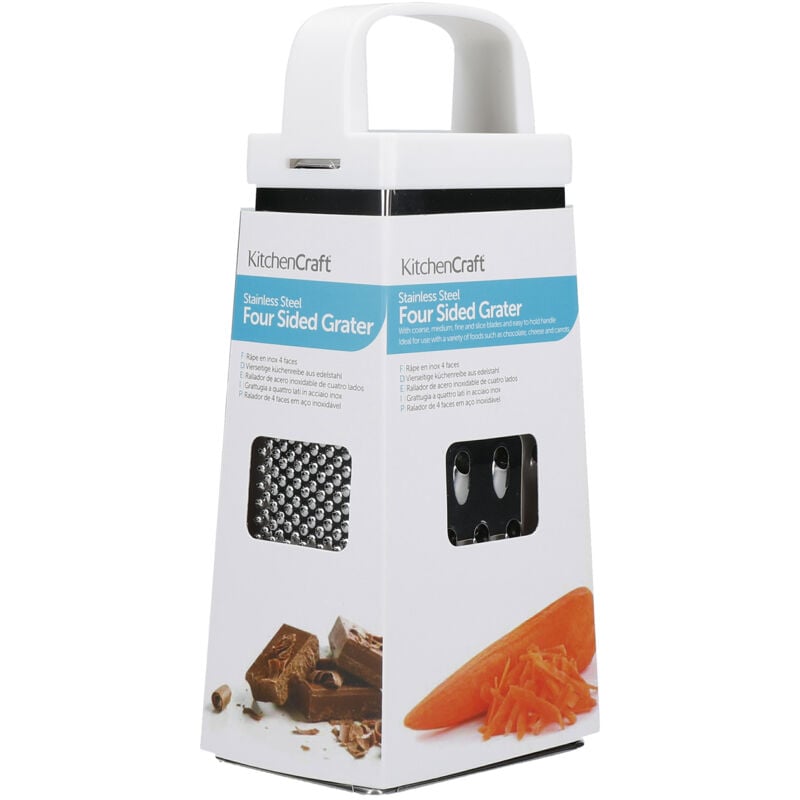 Praticae versatile grattugia de formaggio de acciaio inox de KitchenCraft.Questa grattugia de formaggio de 21 cm de alto e forma de scatola è un utensile essenziale de qualsiasi cucina del mondo, che consente di grattugiare diversi ingredienti e alimenti de un modo conveniente e pulito. Ciascun lato è dotato di lameof di diversa impostazione per sbucciare o grattugiare qualsiasi cosa, dal formaggio ai limoni, al cioccolato, ai cetrioli a fette e molto altro ancora. La sua pratica forma quadrata consente di dirigere la triturazione verso il piatto ed evitare che finisca sul bancone o sul tavolo de la cucina o la sala da pranzo. È inoltre realizzato in robusto acciaio inossidabile per garantire la massima durata ed evitare che i lati si pieghino o si rovinino nel tempo. Integra anche una pratica maniglia per una comoda presa. INFORMAZIONI UTILI: 1 x Grattugia de Formaggio de 4 lati Lavabile in lavastoviglie Garanzia de 12 mesi de KitchenCraft Il tuo marchio de utensili da cucina de! Più