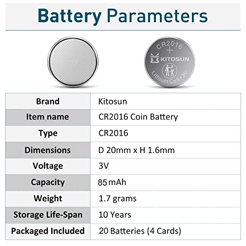 Kitosun CR2016 Batteria Bottone al litio 3V - Pile 3 Volt cr 2016 Sostituzione Della Batterie per Chiave Auto Telecomando Candele di Luce LED Sensore Magnetico Bilance Elementi Indossabili (20 pezzi)