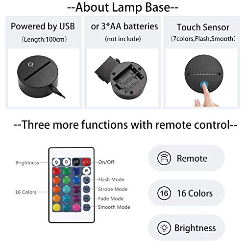 【Comoda e sicura】 La luce notturna 3D può utilizzare l'USB per il collegamento o le batterie 3AA (non incluse) per l'alimentazione. La base della lampada da comodino adotta un processo di progettazione della crepa, la sorgente luminosa utilizza il LED di alta qualità, che è morbido e uniforme, non abbagliante, non sfarfallio, dimmerabile, innocuo per gli occhi dei bambini, fornisce ai bambini dolce e calda notte.