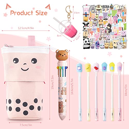 KKSJK Set Astucci Bambini, 1 Astuccio, 1 Tè al Latte Perlato Portachiavi/Portapenne, 6 Penne Gel, 1 Penna a Sfera 10 Colori, 50 Adesivi Tè al Latte Perlato, Regali per Ragazze