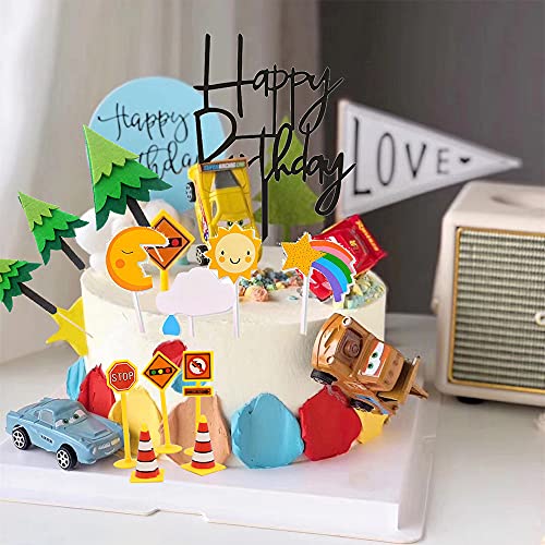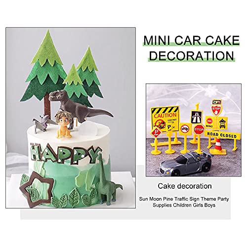 KKTICK decorazione torta auto, 26 pezzi toppers torta auto buon compleanno decorazione torta compleanno sole luna pino e segnali stradali, decorazione torta giocattolo per bambini ragazza ragazzo