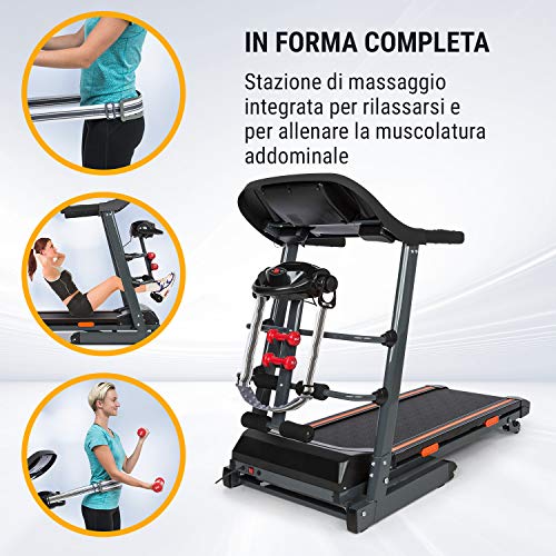 TIENI IL CORPO IN MOVIMENTO: con il tapis elettrico Klarfit Highflyer 2.0 è possibile farlo tra le tue quattro pareti. Il suo potente motore da 1,5 PS porta il tapis roulant fino a 12 km/h, facendo sudare sia principianti che esperti.