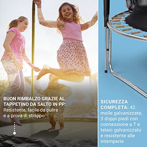 La sicurezza ha la priorità: per i nostri trampolini utilizziamo una rete di sicurezza alta 190 cm, in modo che i bambini non si facciano male. Le barre laterali e il telaio sono dotati di una morbida copertura protettiva per prevenire lesioni.