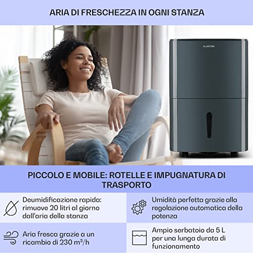 Klarstein DryFy 20 - Deumidificatore a Compressione, Deumidificatore Professionale per Stanze di 40-50 m² (fino 125 m³/h), 20 L/24h, 420 W, Timer, Modalità Silenziosa, Antracite