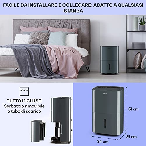 POTENTE: con i suoi 420 watt di potenza e una portata di aria di 125m³ all'ora, estrae fino a 20 litri di umidità al giorno dall'aria, rendendo il deumidificatore Klarstein DryFy 20 ideale per 40-50 m².