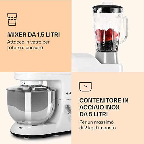 Klarstein Lucia Bianca - Robot da Cucina, Impastatrice, Planetaria con Tritacarne, 2000 W, 5 L, Mixer con Sistema Planetario, Ganci per Pasta, Shaker da 1,5 L, Velocità Regolabile, Bianco Fumo