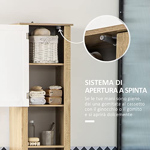 Kleankin Mobile Bagno Alto in Truciolato con un Cassetto, 2 Armadietti e 2 Ripiani Aperti Regolabili, 37x30x184 cm, Bianco e Color Legno