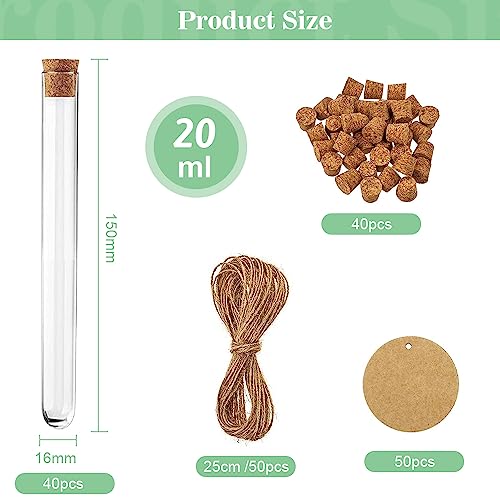 Kleemeiero 40 Pezzi Provette Plastica 20ML con Tappo in Sughero Provetta Portaconfetti Provetta Trasparente Provette Trasparenti con 50 Etichette Regalo, 50 Corda di Canapa 25CM