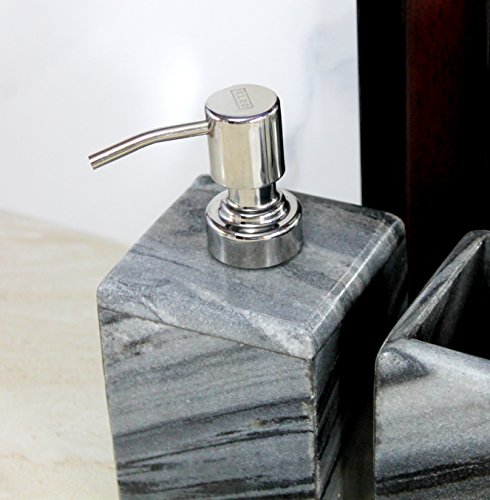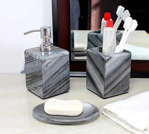 Aggiungi lucentezza e classe al tuo bagno con questo pezzo artistico realizzato in pietra naturale di colore nero/grigio. Questo set da bagno è composto da un dispenser di sapone, portaspazzolino e portasapone, tutti realizzati a mano in colori neutri per adattarsi ad ogni arredamento.