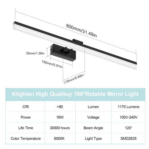 Klighten LED Applique Bagno Specchio 80cm, 18W Lampada da Specchio per Bagno Moderno Nero, Bianco Freddo 6000K Luce da Specchio Bagno, 1170Lumen, 180°Regolabile, Non Dimmerabile