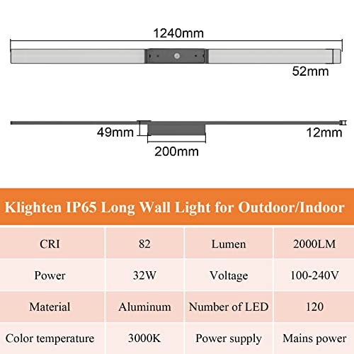 Klighten Applique Lunga da Esterno/Interno 32W 2000LM, IP65 Impermeabile Lampade da Parete Moderno Luci da Parete per Ingresso Giardino Terrazza, 124cm, Bianco Caldo 3000K, Grigio Scuro
