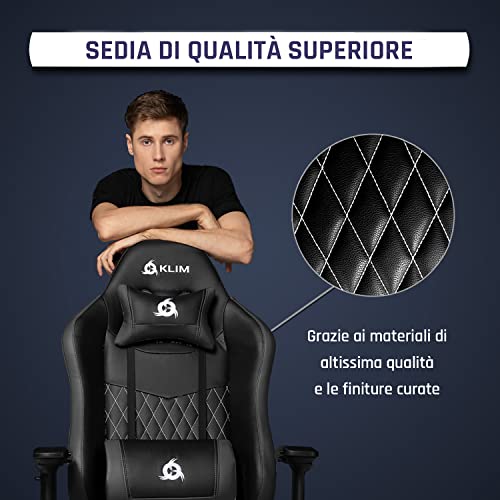 KLIM eSports - Sedia gaming nera di Alta Qualità + Supporto Lombare e Cervicale + Reclinabile + Poltrona Gaming Ergonomica e Regolabile + Pelle Sintetica e Materiali Premium [NUOVA VERSIONE 2022]