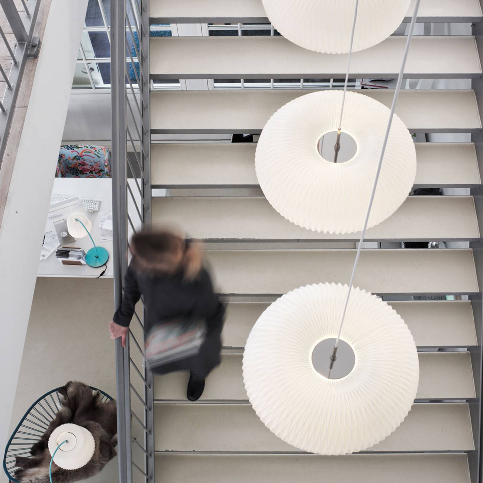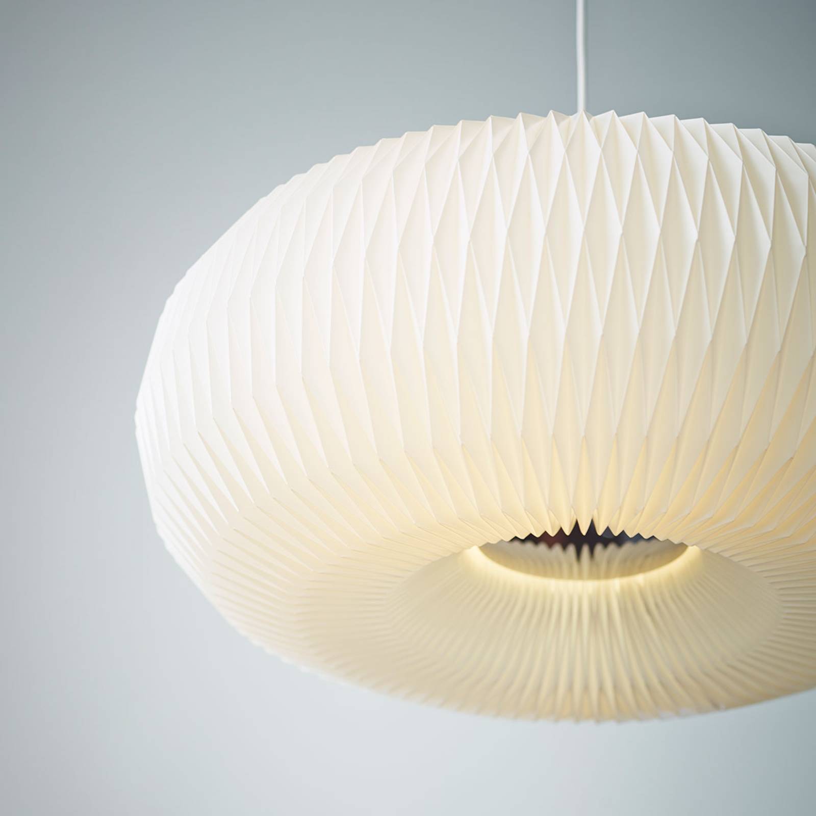 Paralume ripiegato: Apparecchio a sospensione di design Donut Il nome dell'apparecchio a sospensione Donut dice tutto: il paralume dell'apparecchio, realizzato a mano in plastica, ricorda le forme rotonde dei pasticcini americani. Il fatto che con questo apparecchio a sospensione si possano usare solo lampadine a LED o a risparmio energetico rivela già che il suo paralume è particolarmente delicato e va maneggiato con cura. Perché solo in questo modo la qualità e la tecnica di piegatura in filigrana possono essere preservate e dare piacere per anni. Lise Navne ha sviluppato questo modello per il tradizionale produttore di lampade di design danese e ha preso come modello uno dei classici più famosi del produttore, la cosiddetta "fruit lamp" di Kaare Klint. In questo modo, sviluppò ulteriormente la cosiddetta piegatura a croce e la spinse al limite, in modo da creare una lampada rotonda e ben formata dalle pieghe. Le Klint è un'azienda danese produttrice di lampade che non è solo il fornitore di corte della regina danese, ma vanta anche una storia notevole e tradizionale. I paralumi piegati di Le Klint sono oggi conosciuti in tutto il mondo. Hanno avuto inizio quando, all'inizio del XX secolo, l'architetto P. V. Jensen-Klint ha costruito un paralume per una lampada a paraffina. Questo paralume pieghevole fu l'inizio dell'azienda di famiglia, che tuttavia fu fondata solo nel 1943 dal figlio Tage Klint