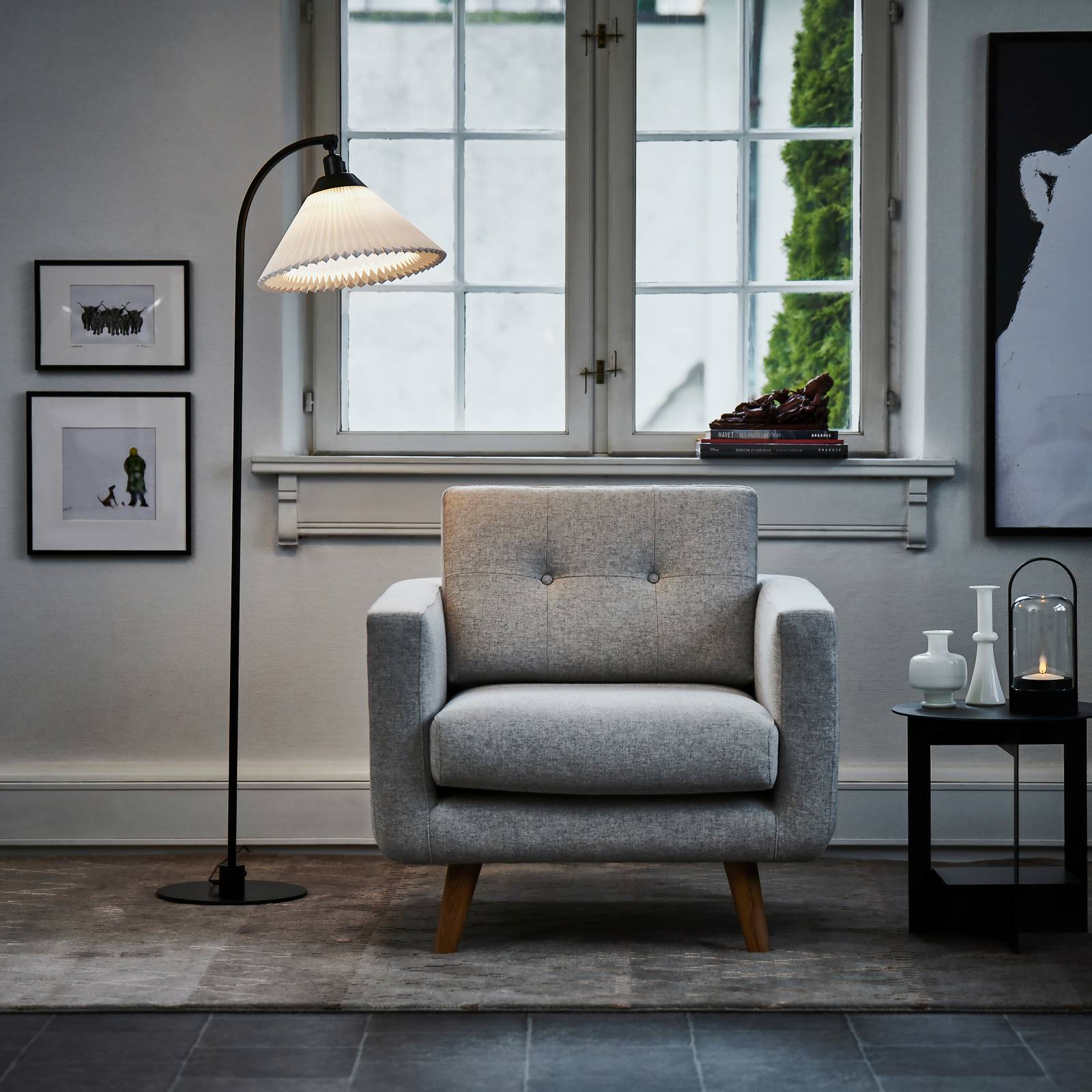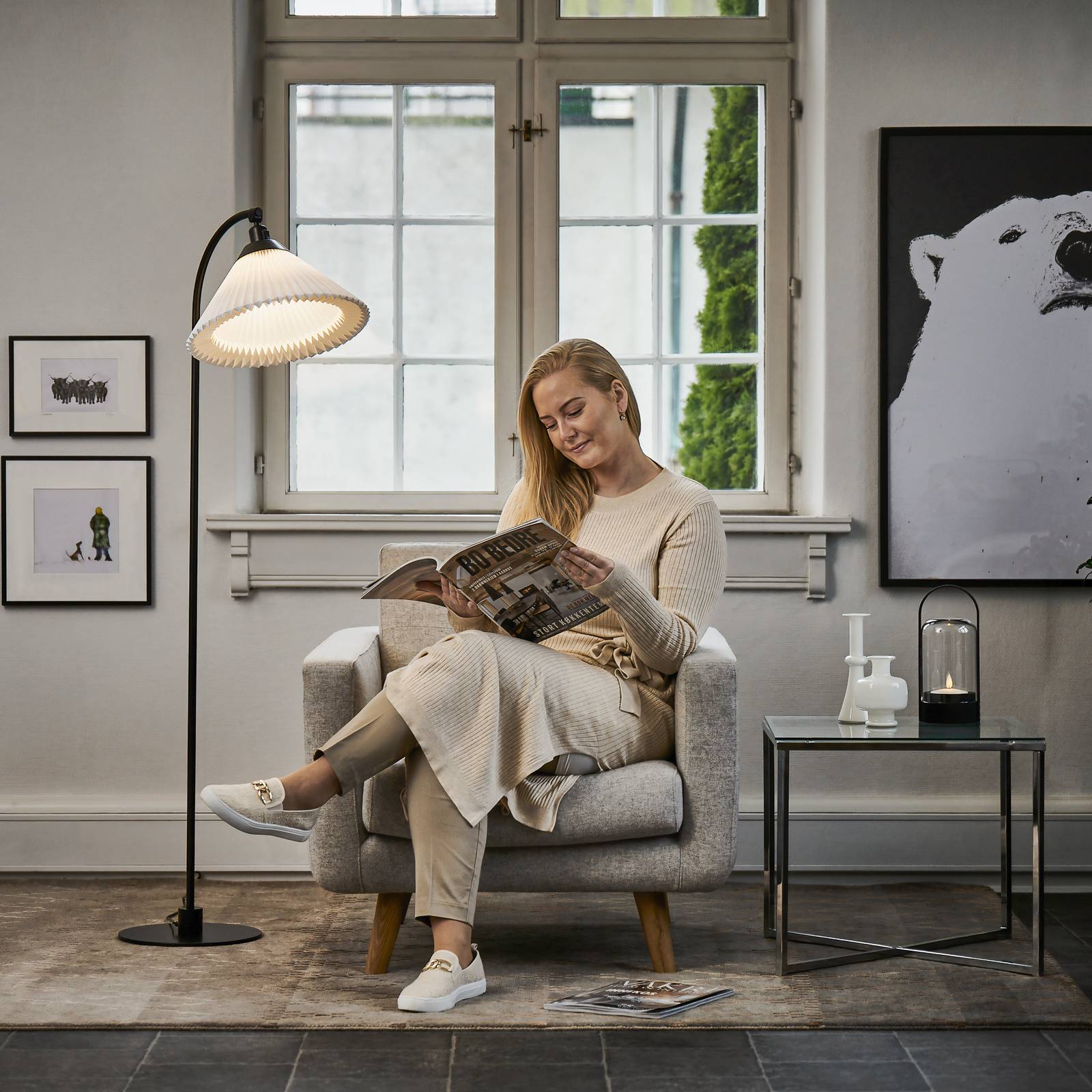 Lampada da terra 368 con struttura in metallo nero e paralume piegato a mano Il modello 368 è un vero classico del produttore danese di lampade Le Klint. È stato progettato dal product designer Flemming Agger e presentato alla fiera di Gothenburg nel 1979. Fino ad oggi, è la lampada da terra più venduta della rinomata azienda. 368 consiste in una semplice cornice di metallo nero e un paralume bianco piegato a mano. Il paralume è piegato ed è il punto di forza visivo dell'apparecchio. Il paralume è collegato al telaio da un giunto inclinabile in modo che il suo orientamento possa essere variato secondo le preferenze e le esigenze personali. Grazie al design a colori senza tempo in bianco e nero, 368 può essere integrata in diversi ambienti abitativi e può, ad esempio, essere utilizzata idealmente come lampada da lettura nella zona giorno. La sorgente luminosa non è inclusa nella fornitura e può essere scelta liberamente in base alla presa corrispondente.