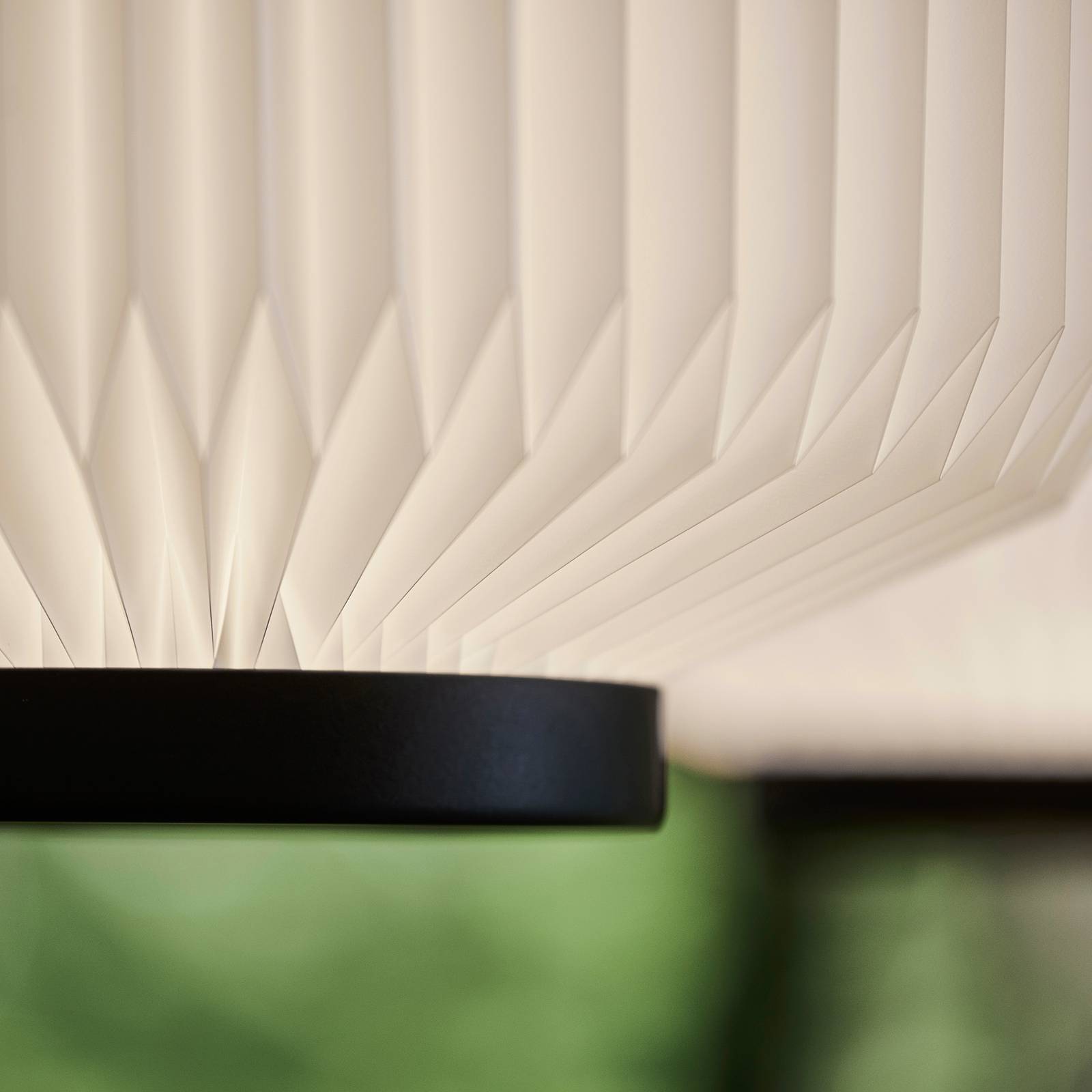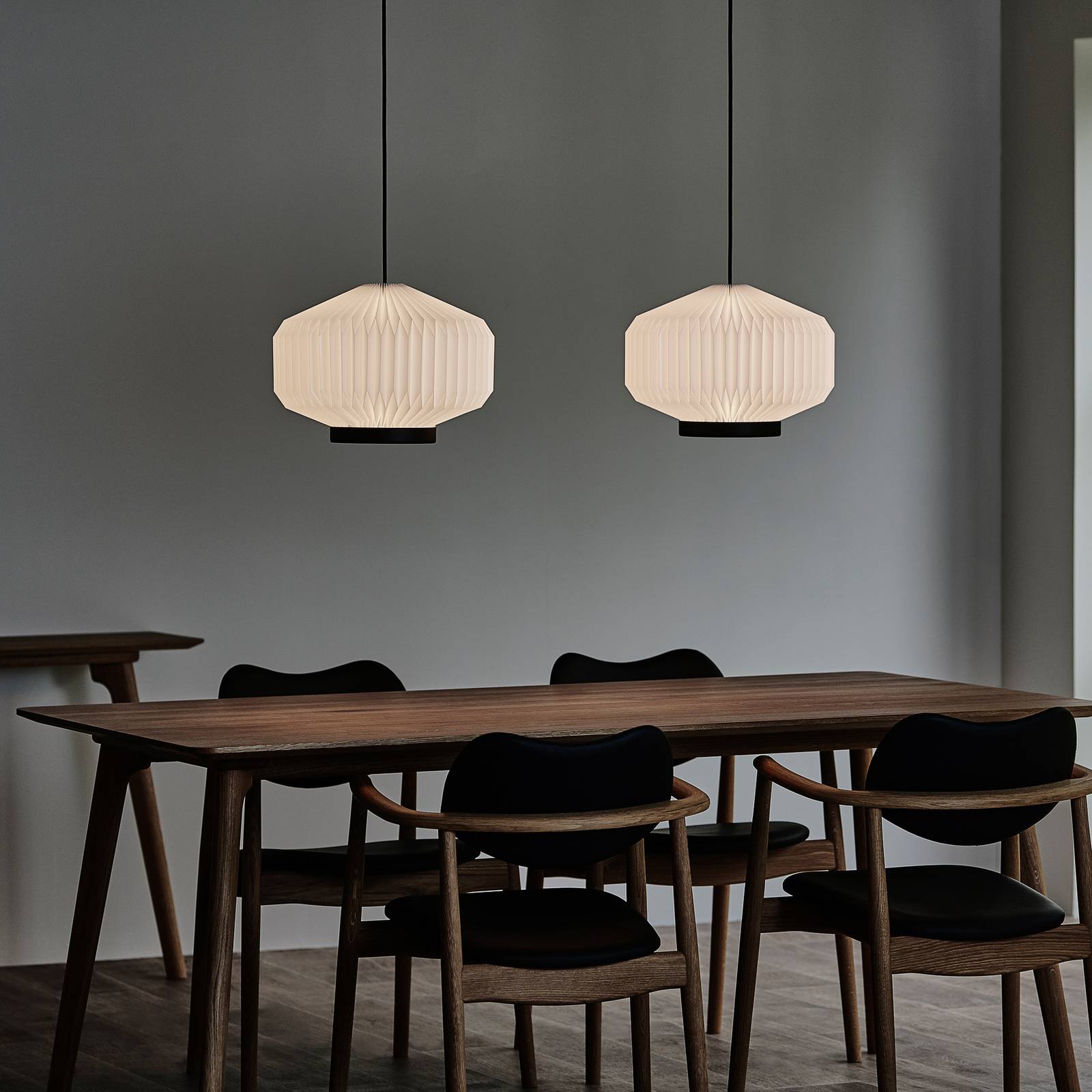 Lampada a sospensione piegata a mano Shibui Medium con paralume bianco e anello di metallo nero La particolarità della lampada a sospensione Shibui Medium è il suo paralume bianco, che consiste in plastica bianca ed è piegato a mano. Il look della lampada a sospensione è completato dalla sospensione nera e dall'anello di metallo, anch'esso nero, che si trova sul lato inferiore del paralume. La selezione di colori monocromatici rende la lampada senza tempo, il che le permette di integrarsi facilmente in diversi stili di interni. L'illuminante non è incluso nella fornitura e può essere selezionato in base alla presa abbinata secondo le preferenze personali. Il produttore raccomanda l'uso di una lampada a LED per evitare l'accumulo di calore all'interno del paralume. Il designer Søren Refsgaard fa riferimento al minimalismo giapponese con la collezione di lampade Shibui e si concentra anche su elementi di design degli anni 50. La sua intenzione era quella di progettare una serie che avesse un legame con Le Klint, ma che avesse anche un proprio carattere. Shibui è caratterizzato da forme e linee definite. Il rinomato produttore danese di lampade Le Klint è noto per i suoi paralumi piegati a mano. - si prega di notare che deve essere mantenuta una distanza minima di 3 cm tra la fonte di luce e il materiale dell'ombra